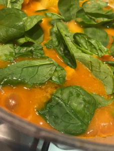 - Add the coconut milk, stock, tin of tomatoes, baby spinach, sweet potato and butternut to the pot. Stir well and bring to a boil.
